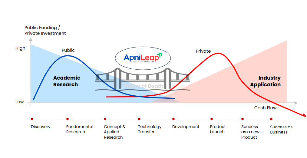 Valley of death reprinted and adapted from Chirazi, Wanieck, Fayemi, Zollfrank, & Jacobs, 2019, under CC By 4.0 license ApniLeap is a part of Netra Accelerator Foundation, a non-profit with 80G and other relevant certifications